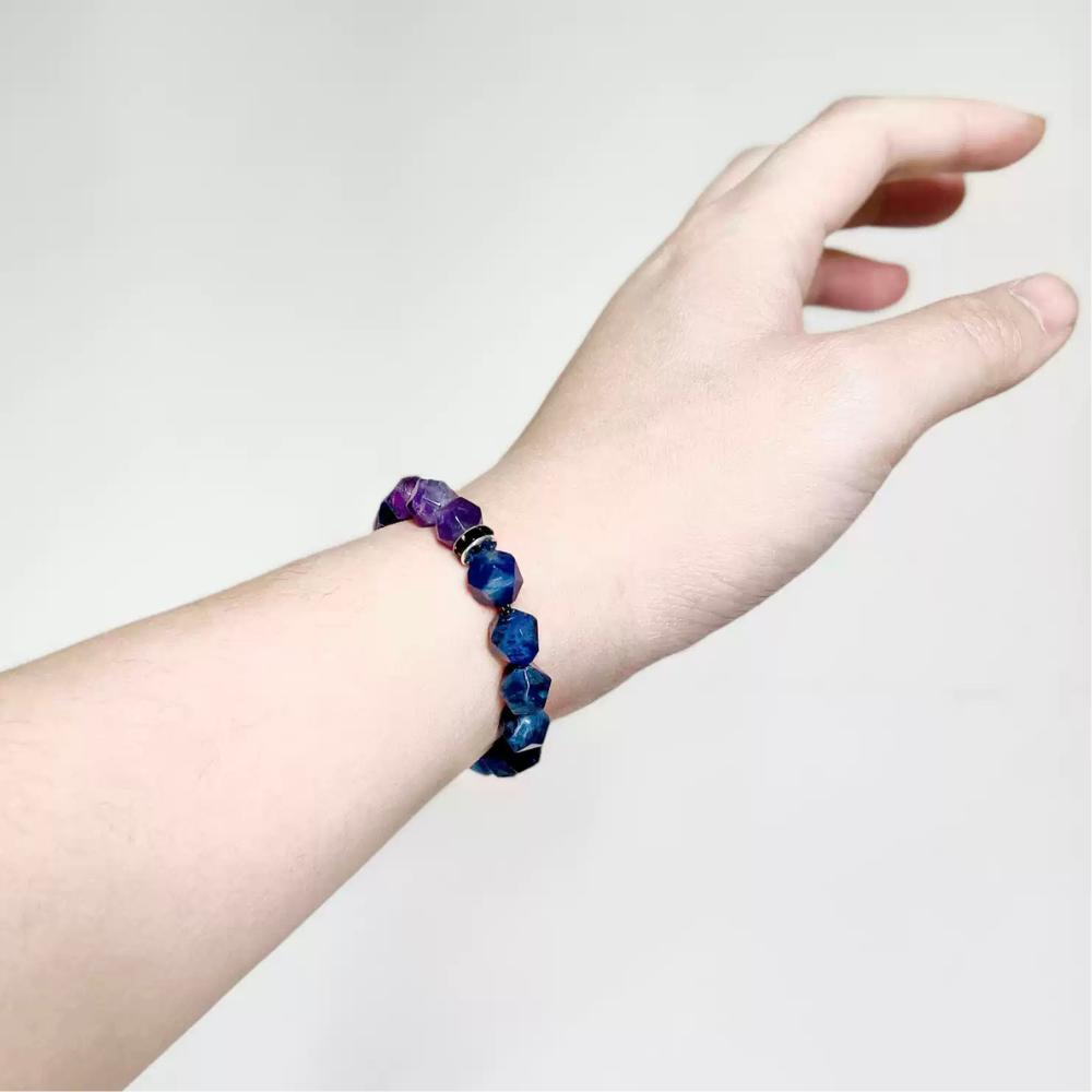 Ispirato alle profondità oceaniche e ai cieli estivi, il bracciale Poseidon Summer Beaded a doppia pietra unisce l'energia serena dell'agata blu con il potere radicante dell'onice nero. Progettato con una divisione a metà, ogni lato riflette un'atmosfera distinta: uno calmo e rinfrescante come la schiuma del mare sotto il sole, l'altro forte e stabile come la roccia delle profondità oceaniche. Questo contrasto unico simboleggia equilibrio, chiarezza e forza interiore, rendendolo un gioiello perfetto per chi ama fluire con pace e potenza.